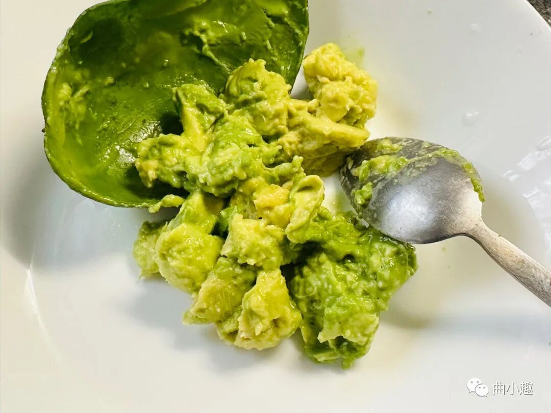等待期间,取熟透的牛油果,用勺子刮成泥备用