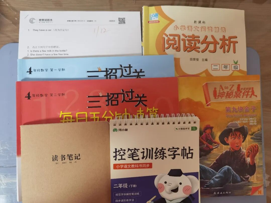 除了完成蚂蚁和新概念作业,妈妈牌作业包括工作日每天自行完成两张计算+一篇阅读理解,妈妈下班亲授读raz+音标收尾/全新英语听力,其他时间自己看书;周末听书做quiz+听写sd词语表+做语文和数学的逸盛周周练,预计每天两小时,其他时间草坪疯跑。