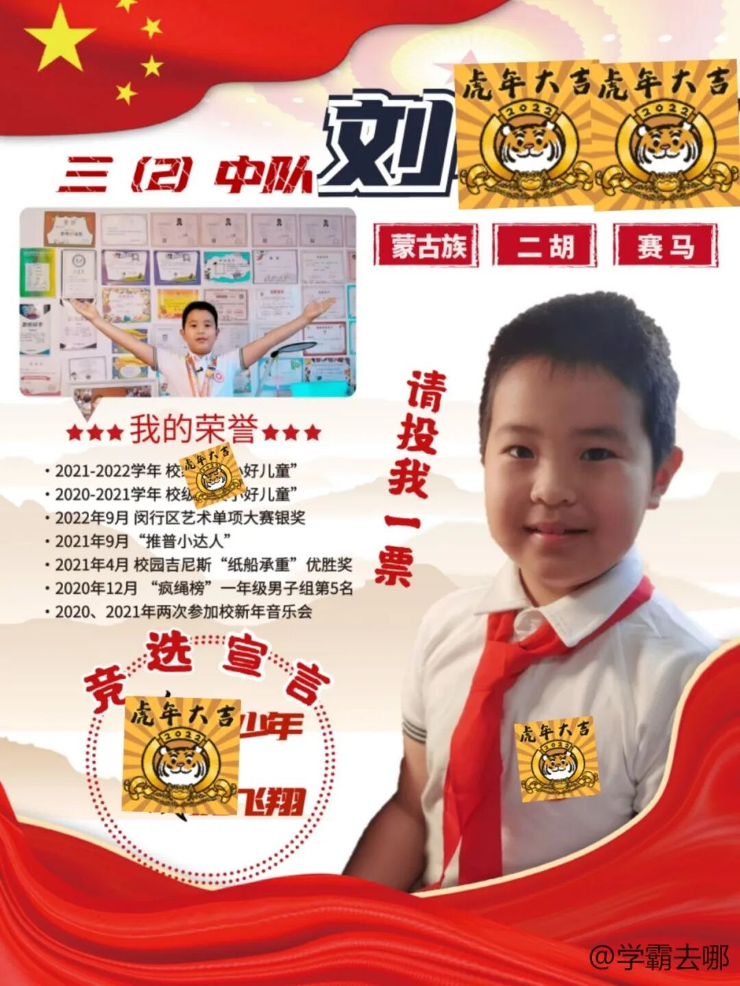 海报要求一张A4纸,竖版,底色不要用黑色。在将个人特色定位为:少数民族、会拉二胡后,保留了令人印象深刻的证书墙(所获荣誉里删掉了不符合双减政策的一些