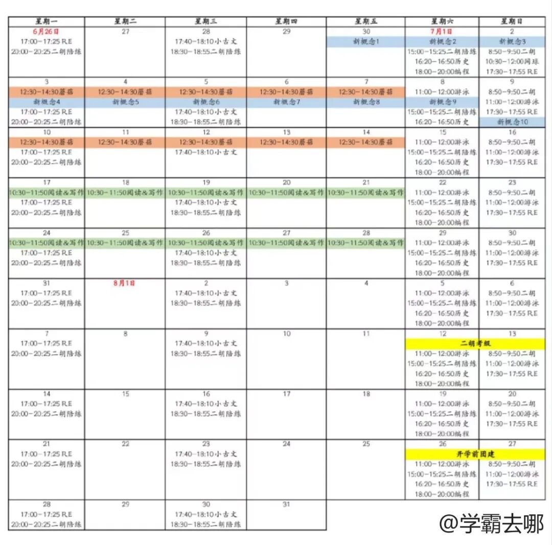 基本原则就是暑假课争取7月上完,8月除了二胡考级时间就相对宽裕很多。