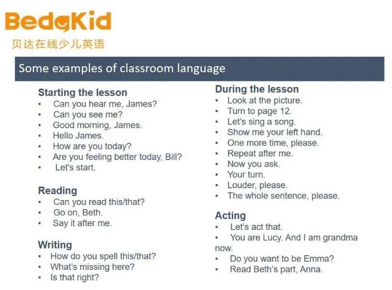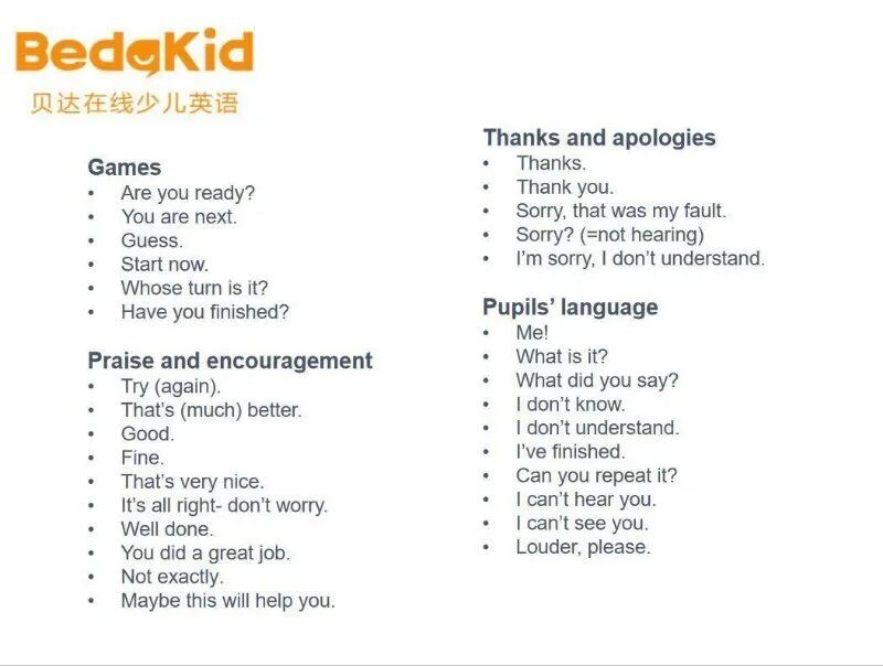 首先在上课前多了解一下外教常用的上课指令,让小朋友更快的进入融入到上课环境中去,能和外教有一个简单的互动: