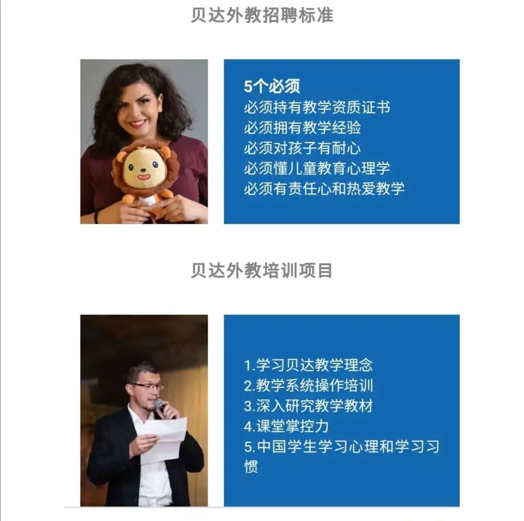 贝达的教师选拔团队leader,长期在海外,物色和培训师资资源。外教从简历筛选到转正需经过8道岗前认证(简历筛选——背景调查——笔试——试讲——培训——上岗——试用——转正)。