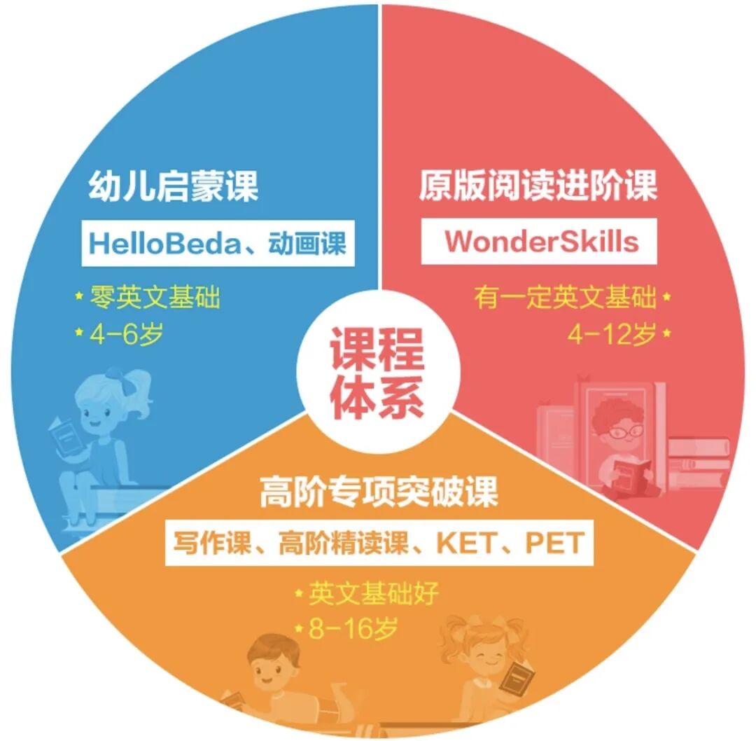 贝达英语的教学体系非常完善,各年龄段、不同水平全覆盖!课时还通用!上一节课扣一个课时!零基础自研发hello beda教材,主教材WonderSkills,高阶有写作和高阶RE精读课程,KET/PET口语模考(剑桥英语通用五级考试)。