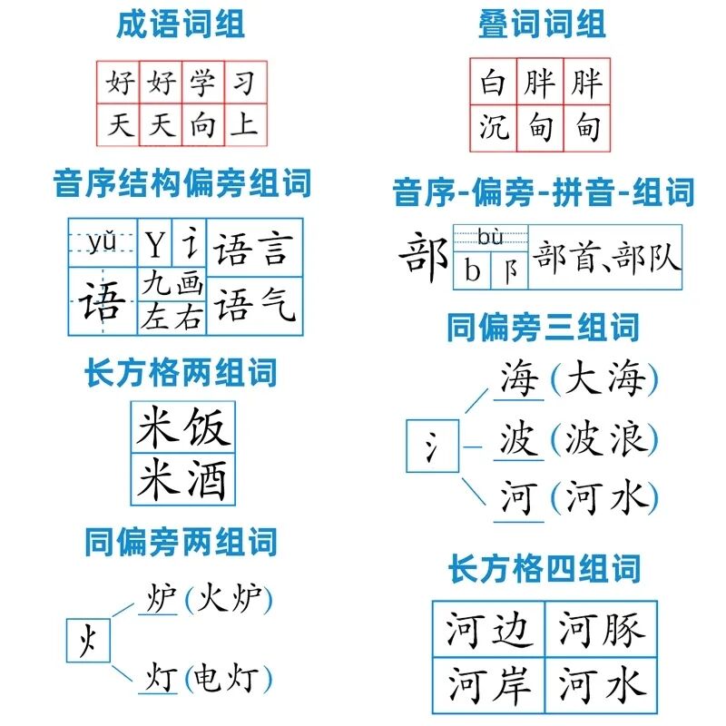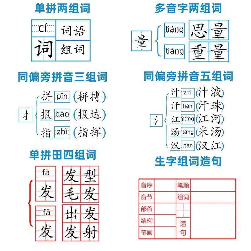 生字不光要知道怎么读、怎么写,也要会用,所以组词很关键。通过组词,可以帮助小朋友理解该字在不同语境下的含义,扩充词汇量;同时也能识别小朋友容易用错的同音字。