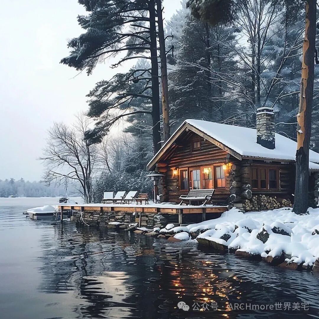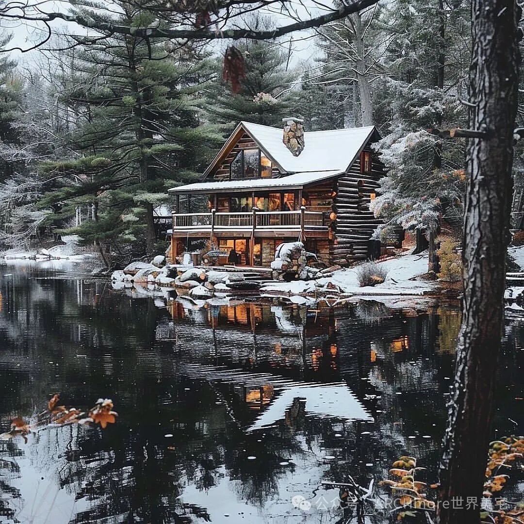 在冬日的寂静之中,当世界被雪覆盖,树木挺立,枝头承载着季节的重负,有一处所在,时光仿佛凝固,它是喧嚣之外的避风港。在这里,空气清新而寒冷,松针的气息与冷冽交融,一座小屋依偎在水边,木结构在白雪映衬下显得深沉,窗户透出温暖的光亮,为寻求孤独中的慰藉者指引方向。