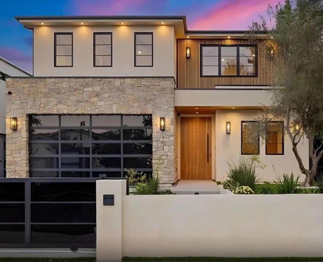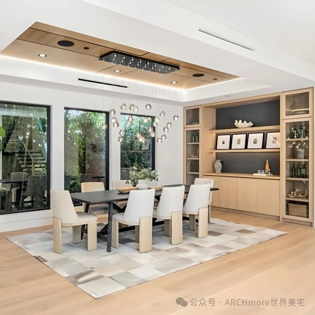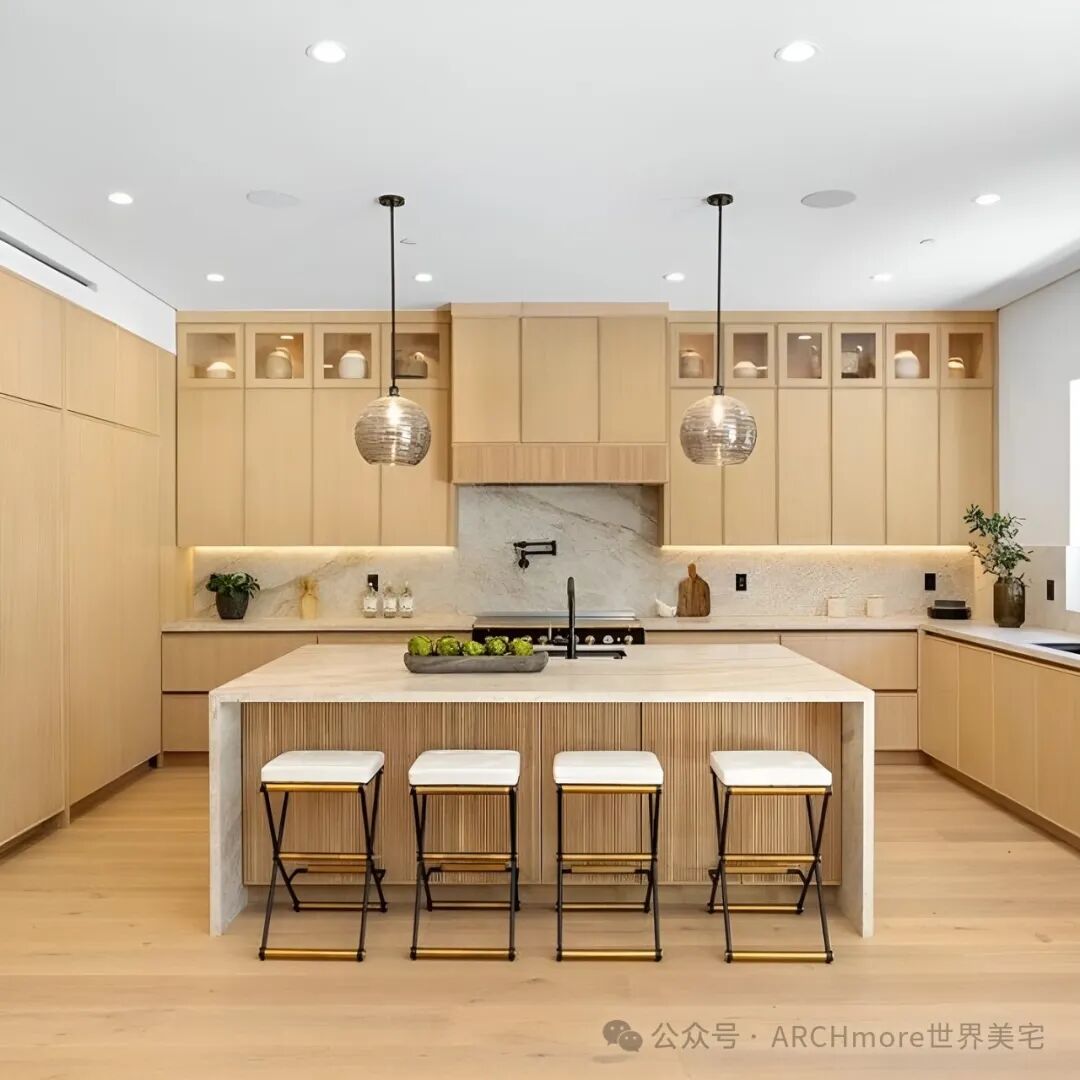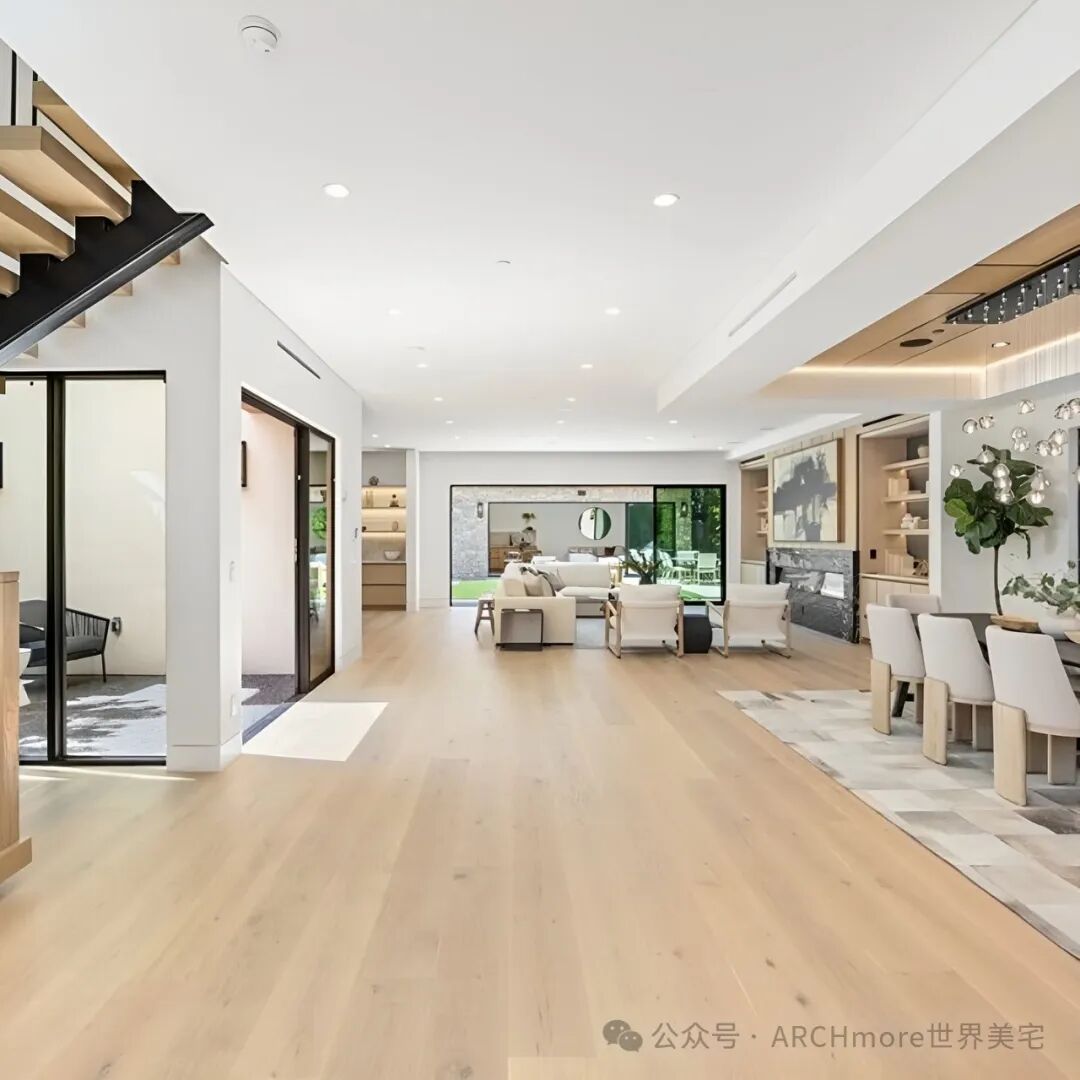这个色调温暖的二层现代农舍,设计现代优雅,采用了宽木板硬木地板和大量的原木制品。