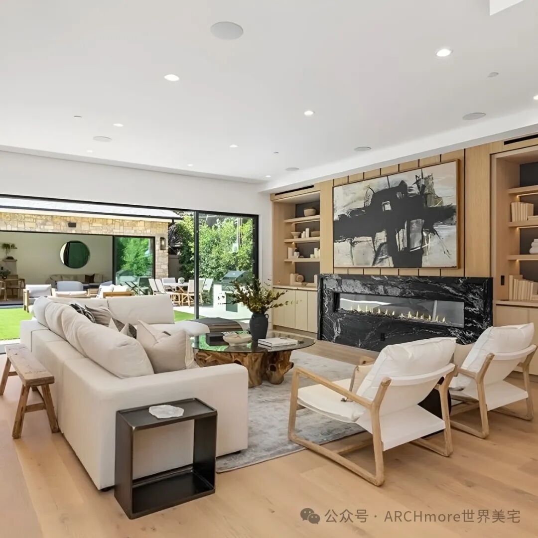 优雅的家庭房,配有定制内置设备、环绕音响、电壁炉和超大落地玻璃门