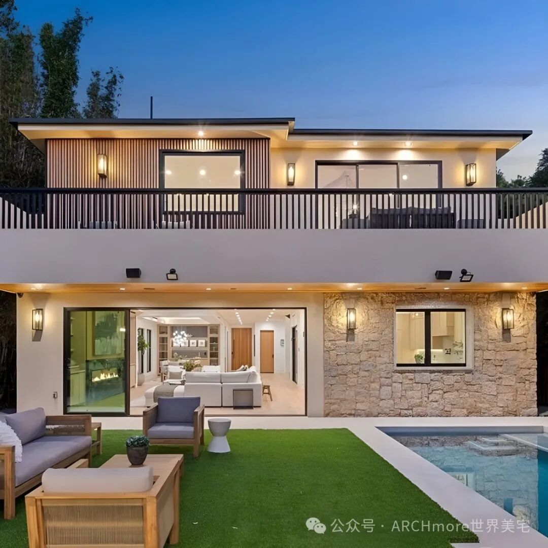 后院娱乐空间,设有波光粼粼的游泳池和水疗中心、内置烧烤中心和宽敞的草坪。