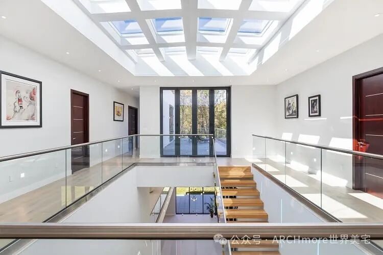 通透的玻璃栏板楼梯与装饰性天窗功能相得益彰,彩色 LED 环绕使分隔六卧室套房的上层空间沐浴在光线中。