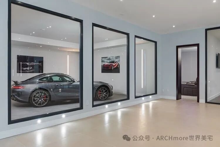 底部车位可以容纳 7-8 个车位,该车库配有华丽的雪松门、环氧树脂地板、色彩缤纷的 LED 照明汽车展厅以及带有存储空间的大型杂物间。