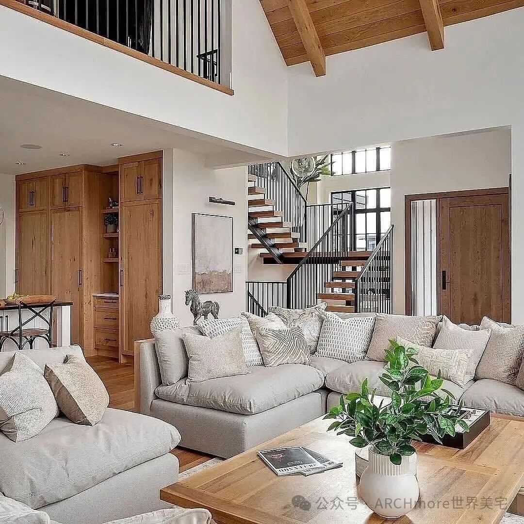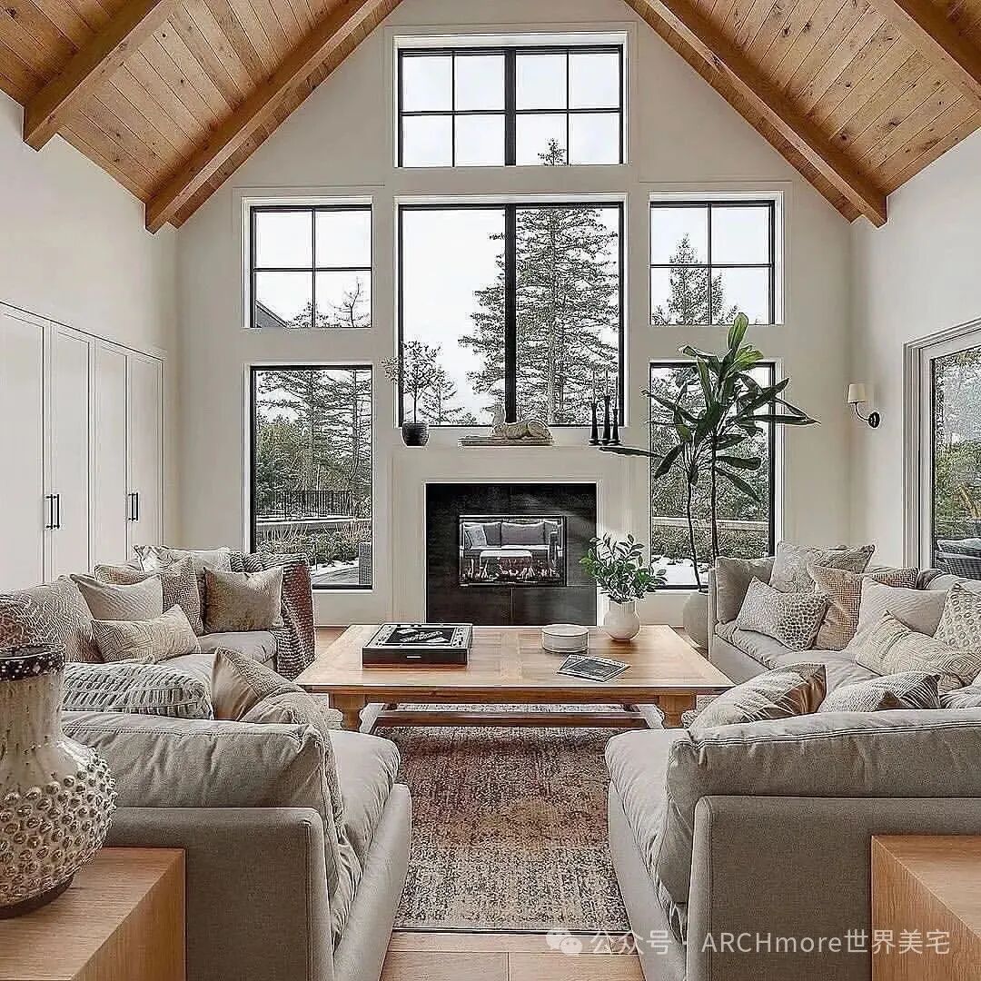 客厅结合坡屋顶做了高天花板的挑空空间,具有现代乡村风格的特点,高耸的木质屋顶梁和大玻璃窗提供了充足的自然光线并增强了空间感。