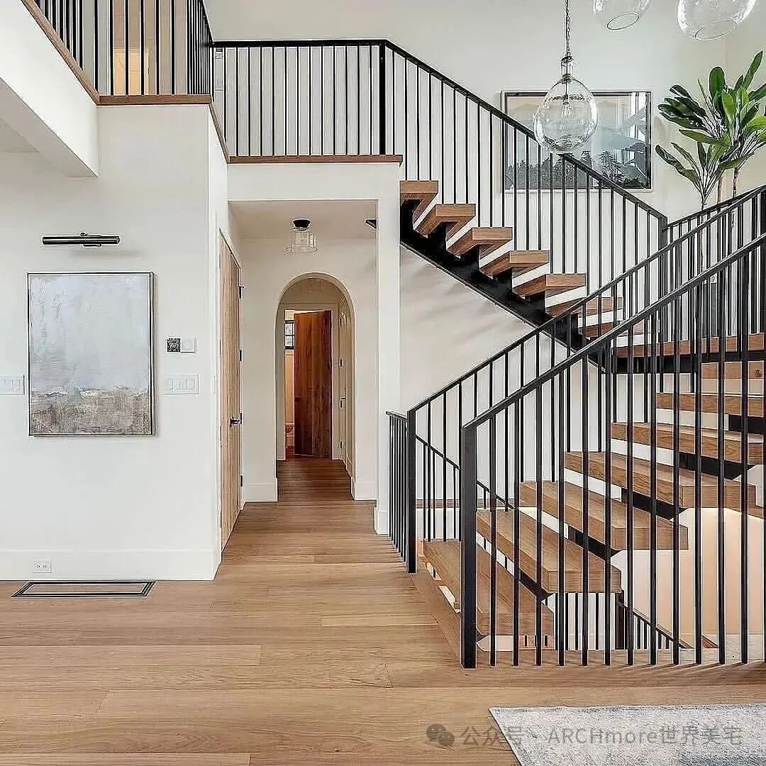 客餐厅桌椅、楼梯扶手大量采用原木制作。栏杆采用简单的直线型设计,没有过多的装饰,呈现出现代风格的简洁美感。