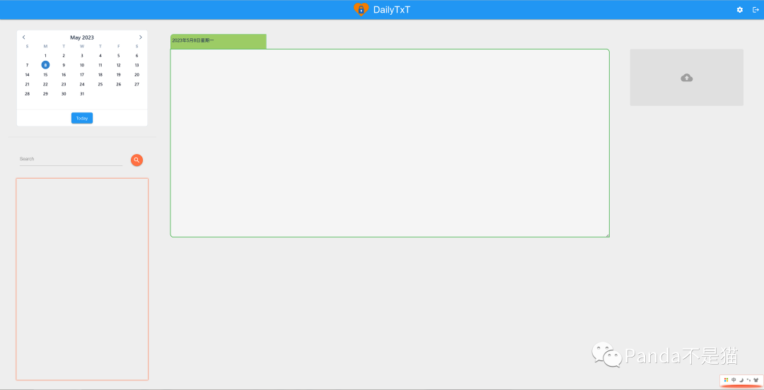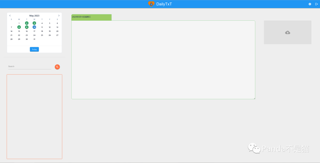 左上角为日期,点击即可跳转到当天日记,蓝色为选中日期,绿色为当天有日记,红色为当天有上传图片;中间便是编辑区了,编辑器测试不支持markdown;右边便是图片上传的界面。