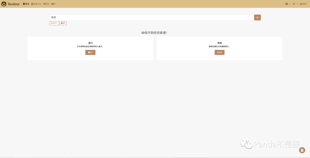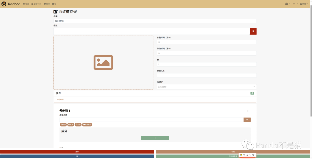 在所有设置完成之后便会显示这样的界面,空空如也,那么我们来建一个食谱,就以熊猫最爱吃的西红柿炒蛋为例子,点击创建食谱命名为西红柿炒蛋。