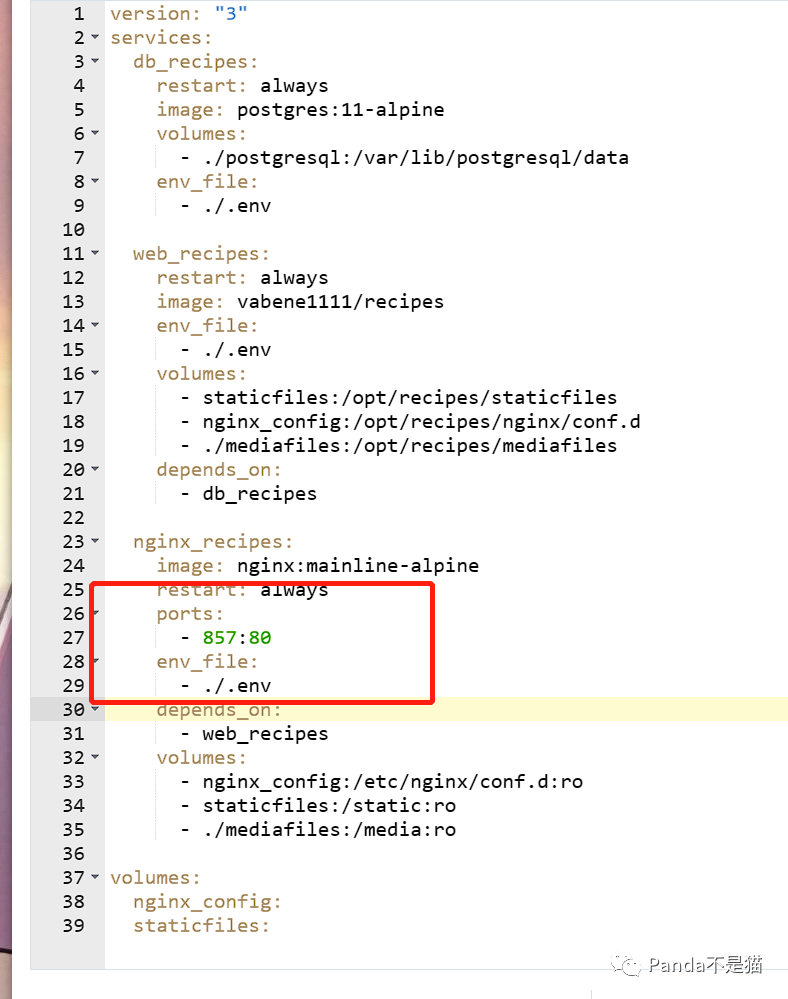 最后我们需要编辑一下docker-compose.yml文件,确保端口没有占用,我这里将端口设置为了857,你们随意,只要不冲突就行了。
