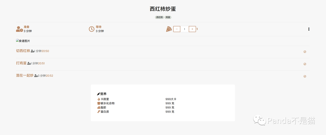 将所有步骤完善之后,便能查看你的食谱了,我这里是添加了图片的,但是不知道为什么没有显示后面我再排查一下原因,先大概这样吧!