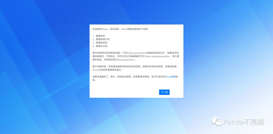 # 新建文件夹 jpress 和 子目录mkdir -p /volume1/docker/jpress/{addons,attachment,data,templates/dockers,WEB-INF/addons,wp-content}# 将 docker-compose.yml 放入当前目录# 进入 jpress 目录cd /volume1/docker/jpress# 一键启动docker-compose up -d