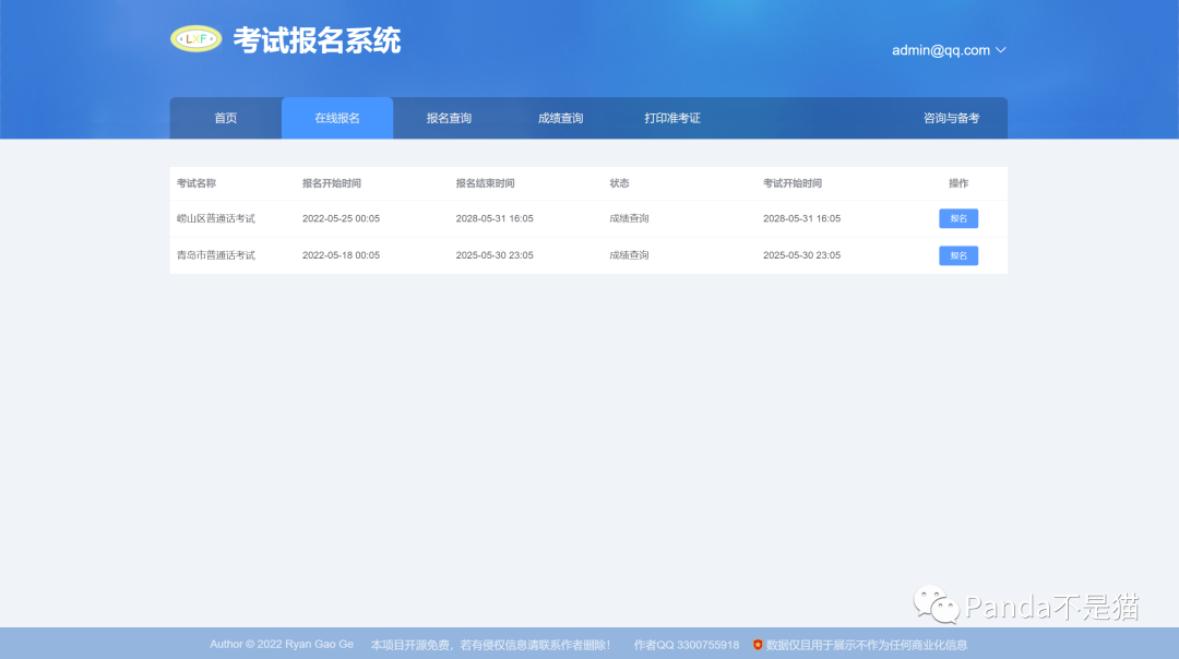 前后端分离可支持一键部署,一个很正规的考试系统。具备自动化发布考试资讯,到达对应时间自动发布对应公告、引入支付宝在线支付功能、导出每场考试报名人信息Excel表格、准考证打印功能,形成Word文档、成绩查询功能,支持导入成绩Excel表格等等众多功能。特别实用的容器,但是这一类容器针对性很强,不需要的就是不需要,所以如果有人有需求我可以单独出一期。