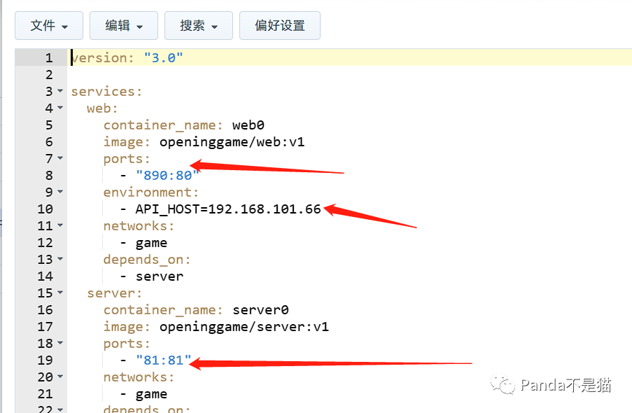 随后我们进到群晖,去修改docker-compose.yml文件,文件所在位置在/volume1/docker/game/qp文件夹下。我们需要修改的为80本地端口以及服务器地址。服务器地址改为你的群晖ip地址,端口81端口不能更改,否则会出现连接不上的情况。