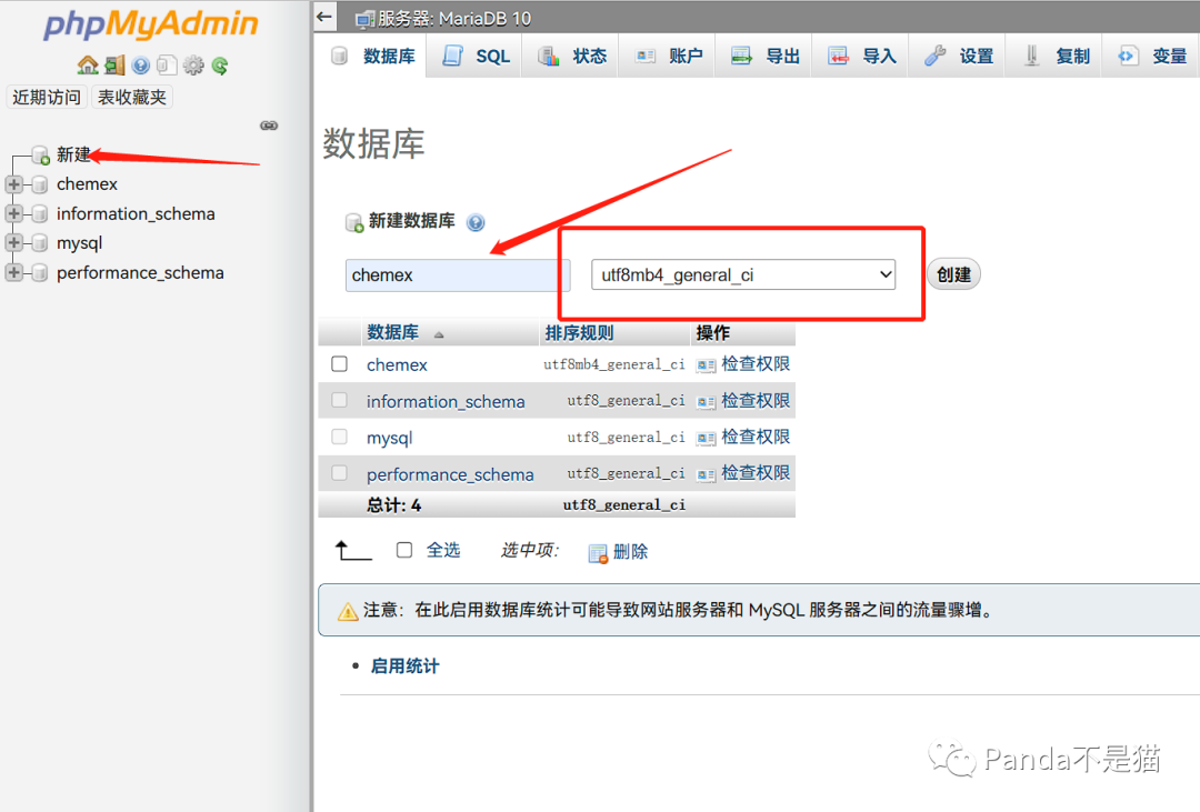 随后我们打开phpMyadmin,进到数据库中新建数据库将其数据库命名为chemex,这里需要注意,数据库的排序规则要设置为utf8mb4_general_ci,不然可能会存在连接不上数据库或者无法正确生成数据库数据文件的情况!