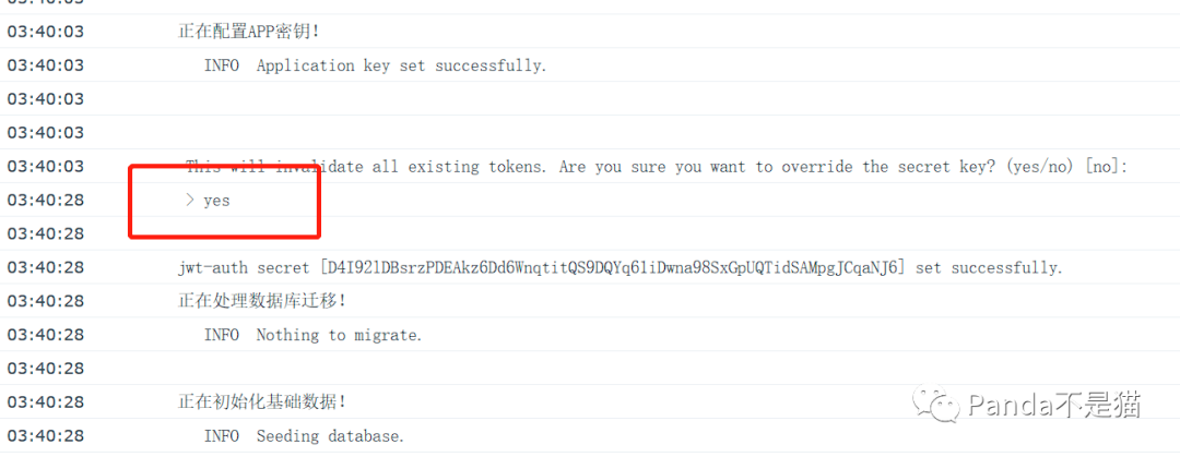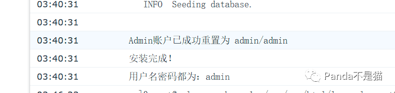 到这里就可以启动容器了,当然启动后我们还是不能访问项目的,还需要进行数据库迁移命令。这里直接在终端机中输入命令:php artisan chemex:install就可以了,中间会弹出秘钥无法使用,是否新建秘钥,输入yes即可。随后你会看到它在加载各种数据文件,最后会提示你账号密码。
