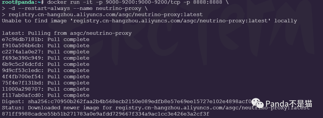docker run -it -p 9000-9200:9000-9200/tcp -p 8888:8888 \-d --restart=always --name neutrino-proxy \registry.cn-hangzhou.aliyuncs.com/asgc/neutrino-proxy:latest