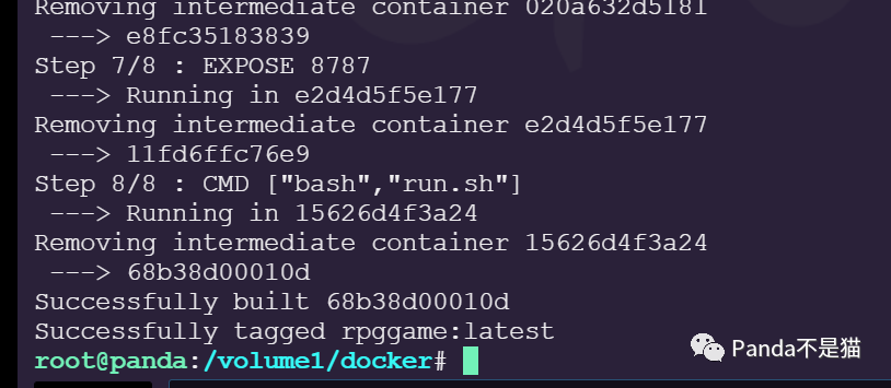 随后我们还是链接群晖获取管理员权限,然后输入docker build -t rpggame .进行容器构建。容器构建过程很久,容器大概3G左右,等待命令行出现这样的情况就代表构建完成,就能在docker ui中看到容器了。