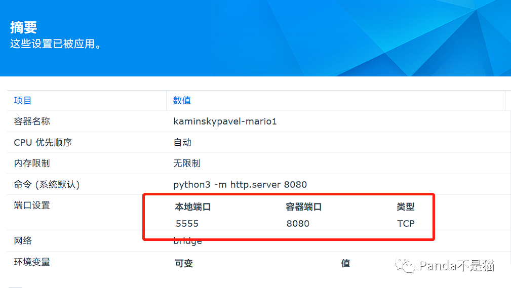 拉取完之后我们直接命令行启动也行,对于小白可以转到群晖的docker UI界面直接启动,只需要将端口8080映射到本地即可。
