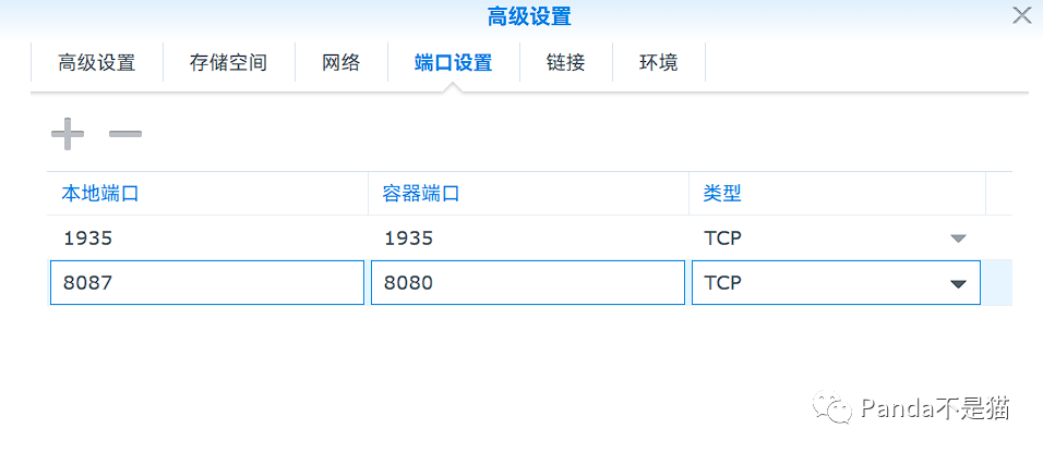 随后我们进到容器设置界面,将data文件夹映射路径设置为/app/data。容器本身没有暴露端口,所以我们需要自行添加容器端口1935与8080。