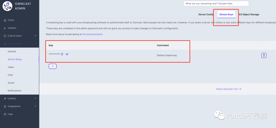 改好密码后我们点击home能看到Streaming URL地址,这便是你的推流地址。而在刚刚更改密码的界面我们能看到Stream Keys,这便是推流的秘钥了。