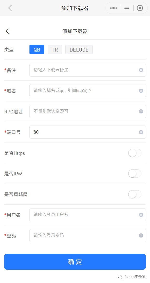 点击右上角的+号,填写下载器的备注以及下载器的地址和端口号,再输入用户名密码点击确认就可以添加下载器了。同时你还可以选择是否开启v6以及是否使用https协议。