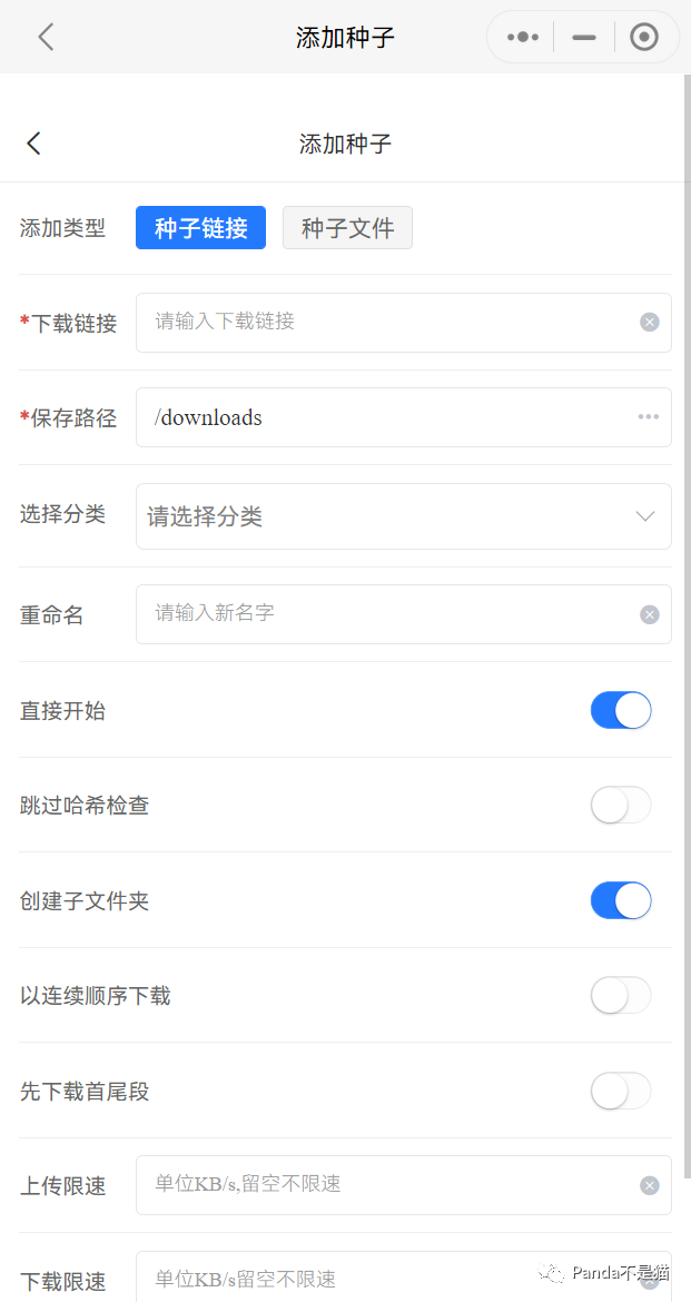 在下载器添加好之后我们还需要去添加下载站点,如果没有站点你也可以将它作为一个普通的种子下载器使用,进入下载服务器后,点击右下角+号,通过输入链接或者上传种子文件下载。