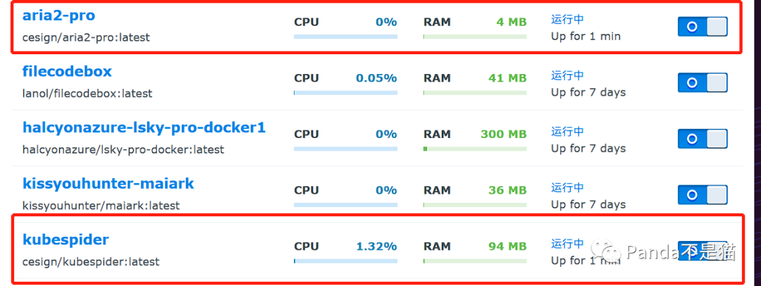 最后回到群晖的docker中能看到多出来两个容器,分别为aria2-pro与kubespider。