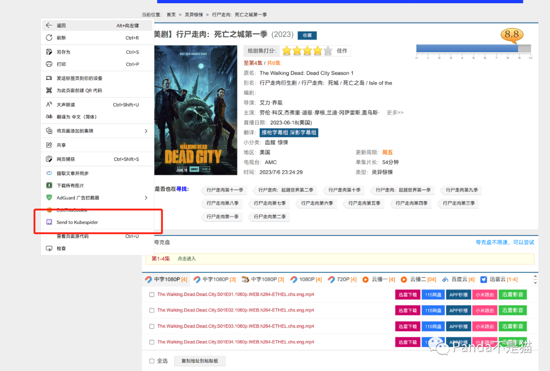 所有设置好之后我们就可以直接在各大网站下载视频了。譬如美剧天堂,点进想下载的内容的界面后右键能看到插件名,直接点击便会推送到Aria2。