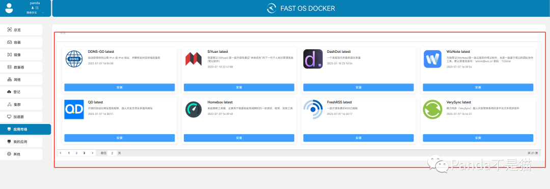 下面的我们就不一一介绍了,大都没有太大改变,而本次改变最大的便是应用市场了。应用市场目前可自动化部署的应用已经来到了21条了,其中不乏一些常用以及实用的项目。例如qlmb、heimdall以及DDNS-GO和思源笔记,而这些项目都是采取拉取的最新镜像源的形式去部署。