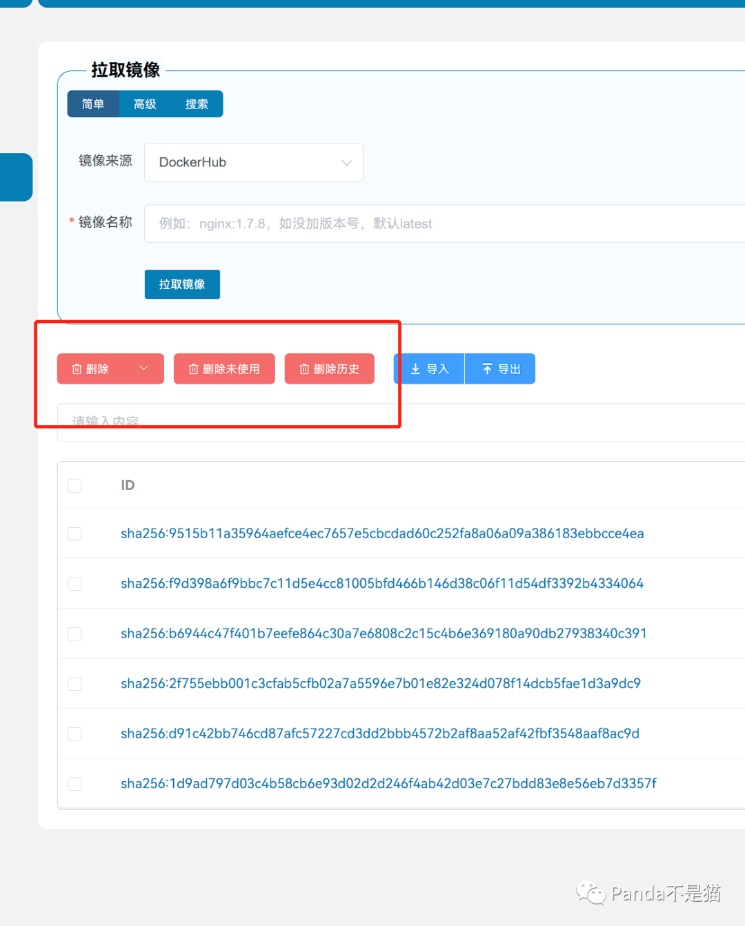 而在镜像界面,相对上次并没有改变。还是三种拉取新镜像的方式,同时还提供了批量删除未使用镜像的选择。很人性化。