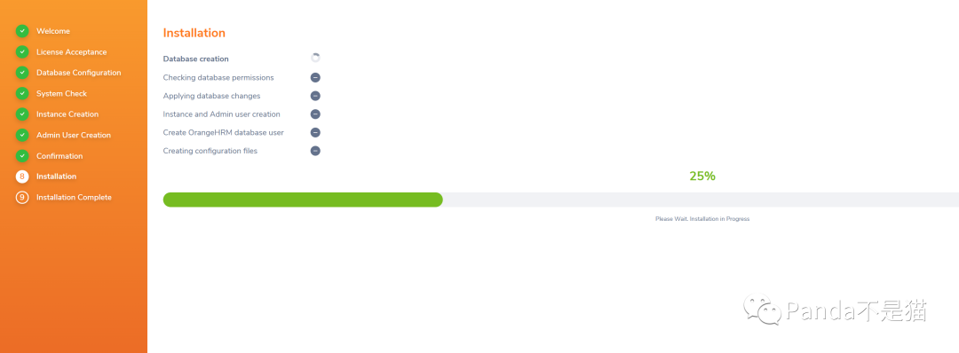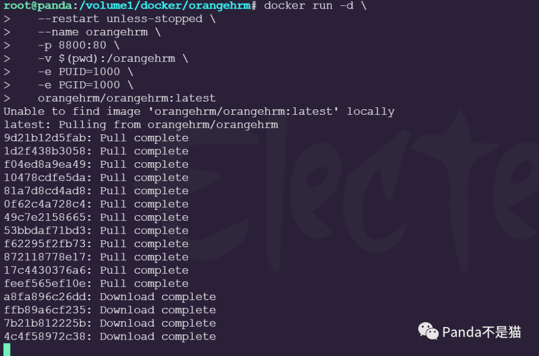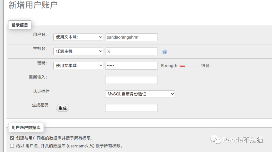 为了方便好记我这里用了panda为数据库密码,大家自行部署时可以设置一个比较复杂点的。在设置好之后便得到了数据库用户:orangehrm数据库密码:panda数据库库名:orangehrm。之后再在docker文件夹中新建一个orangehrm文件夹用于数据持久化。