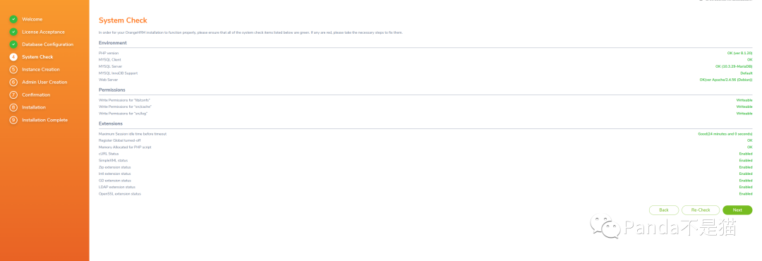 在第三步是需要注意,这里我们选择Existing Empty Database随后再将刚刚创建的数据库信息填入进去。确认无误之后下一步,会弹出环境监测,全部OK就代表没有问题。