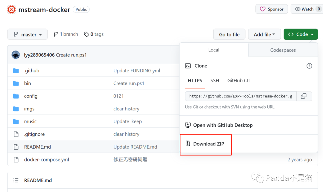 直接拉取这样的方式是最简单的。当然你也可以通过直接到项目界面下载文件,再上传到docker文件夹将项目文件解压后得到目录树。