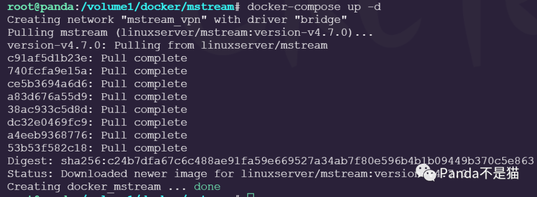 最后我们再进入ssh界面,cd到项目的根目录下,也就是yml文件所在目录。执行命令:docker-compose -d up就可以看到项目拉取以及启动情况了。完成会是如下这样: