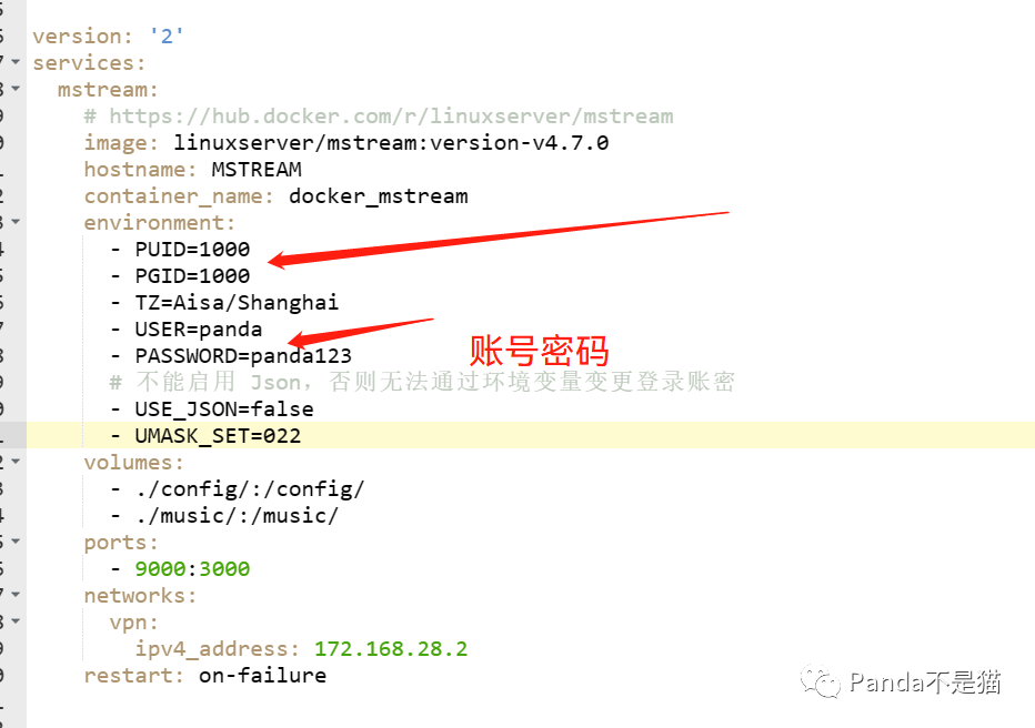 项目下载好之后我们还需要去更改他的yml文件,将其中的PUID以及PGID填写好,这里默认是没有的,我已经填写了。还需要设置好管理员账号与密码。