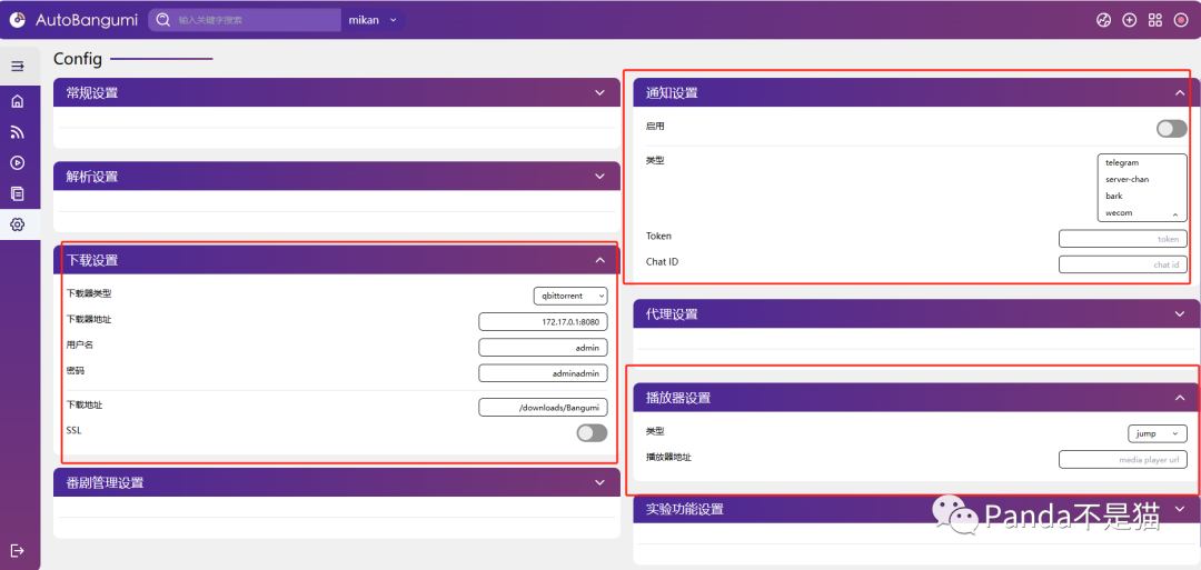 在项目设置汇中,你可以设置QB下载器的地址以及媒体播放器的API,同时,你也可以设置通知提示,但目前兼容的通知服务不多。