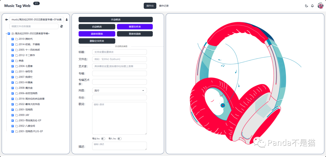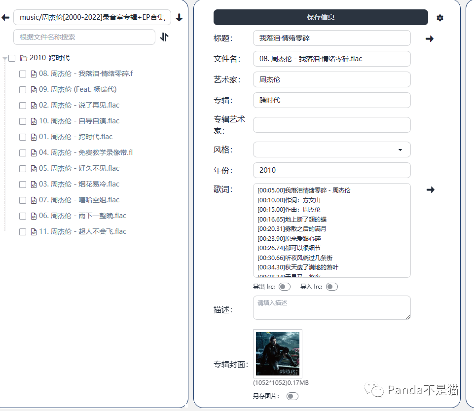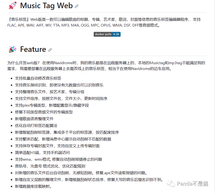 『音乐标签』Web版是一款可以编辑歌曲的标题,专辑,艺术家,歌词,封面等信息的音乐标签编辑器程序,支持FLAC, APE, WAV, AIFF, WV, TTA, MP3, M4A, OGG, MPC, OPUS, WMA, DSF, DFF等音频格式。现在支持docker部署啦!关于这个项目我就不多介绍了,大家可以去看看StarK-C的文章,他详细写过该项目的软件版本,而本次熊猫借花献佛介绍一下docker部署的web版本。