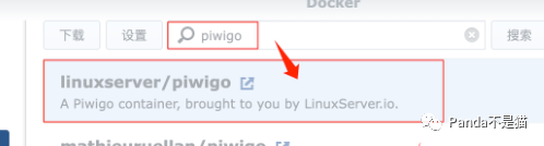 在注册表中搜索 piwigo ,选择第一个 linuxserver/piwigo,版本选择 latest,linuxserver也是构建了很多不错的能够用于群晖的docker,可以点进他的主页去看看。