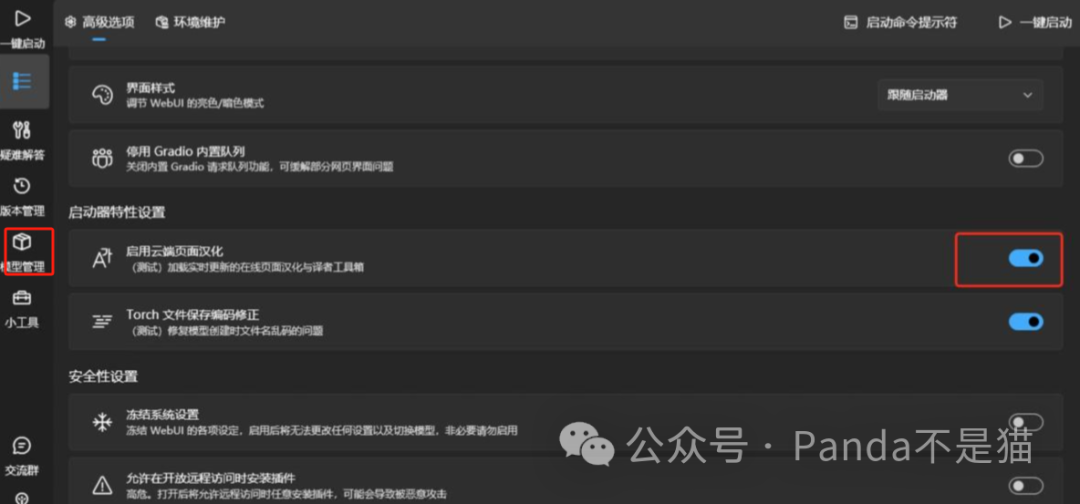 在启动前我们还需要去设置中打开云端汉化,同时你可以去第四个模型管理中下载你想要的模型,这些一切准备好我们再去启动。