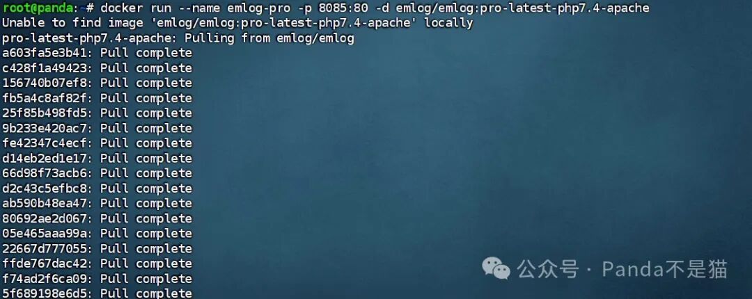 该项目的部署很简单,如果你懂命令行,那么直接输入:docker run --name emlog-pro -p 8080:80 -d emlog/emlog:pro-latest-php7.4-apache,就可以拉取镜像了,记得改一下端口即可。