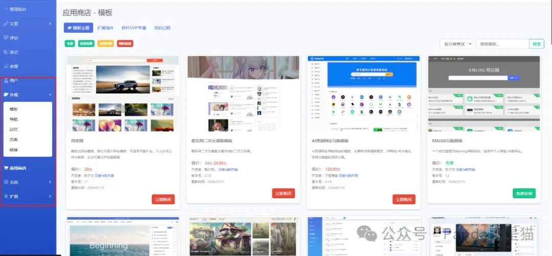 除了博客应有的功能,比较不错的是它拥有在线模版商城,里面有免费以及付费模版,但有一点不好的是,该功能必须为授权用户才能使用,也就是你必须购买付费版。除开这些,外观管理、用户管理以及扩展等等也都有。