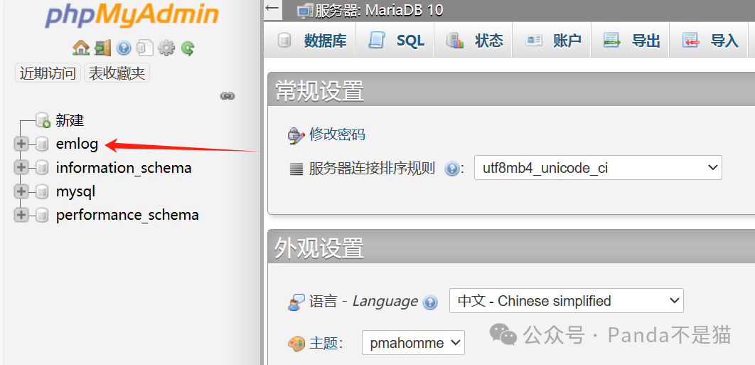 有了数据库之后我们需要新建数据库emlog,随后容器部署成功之后浏览器输入http://nasip+端口号访问项目安装界面。