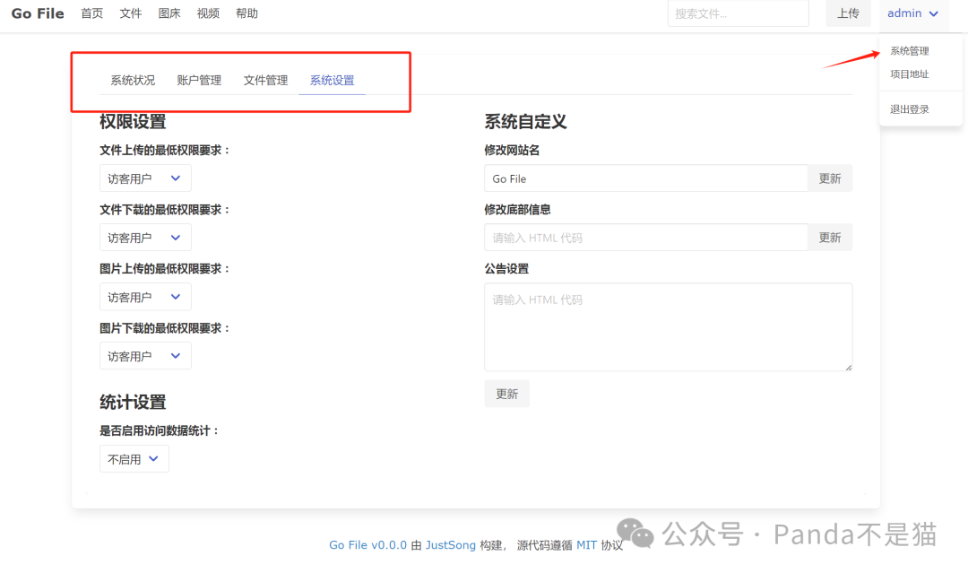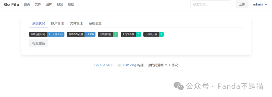 鼠标移到右上角用户界面,则能看到系统设置了。提供了系统状态展示、账户管理、文件管理以及系统设置四个功能,每个功能下的内容也很简单并不复杂。