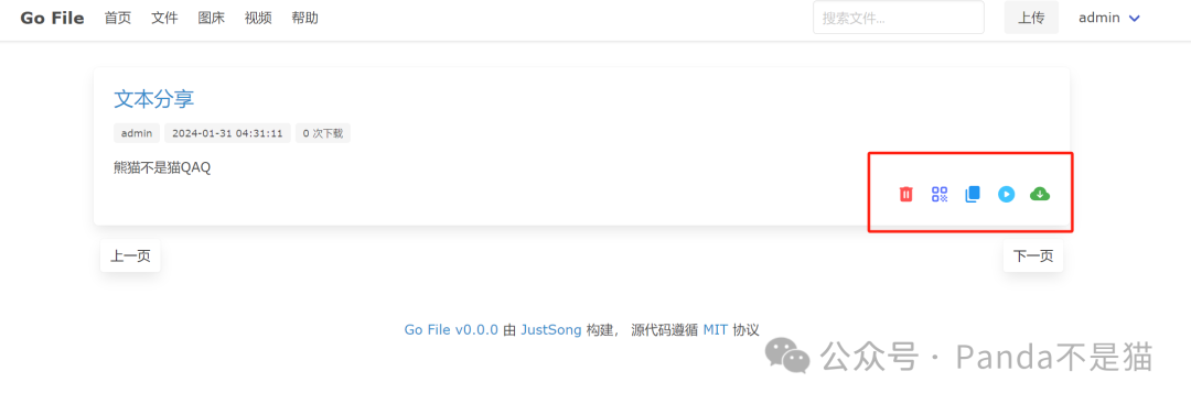 生成文件之后,就能在首页看到对应的内容了。右边从左到右分别为删除、二维码分享、复制链接、预览文件以及下载文件。